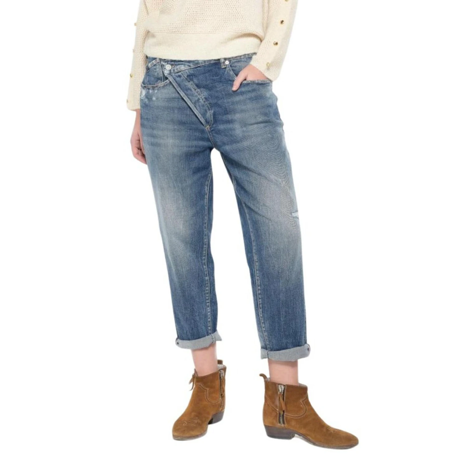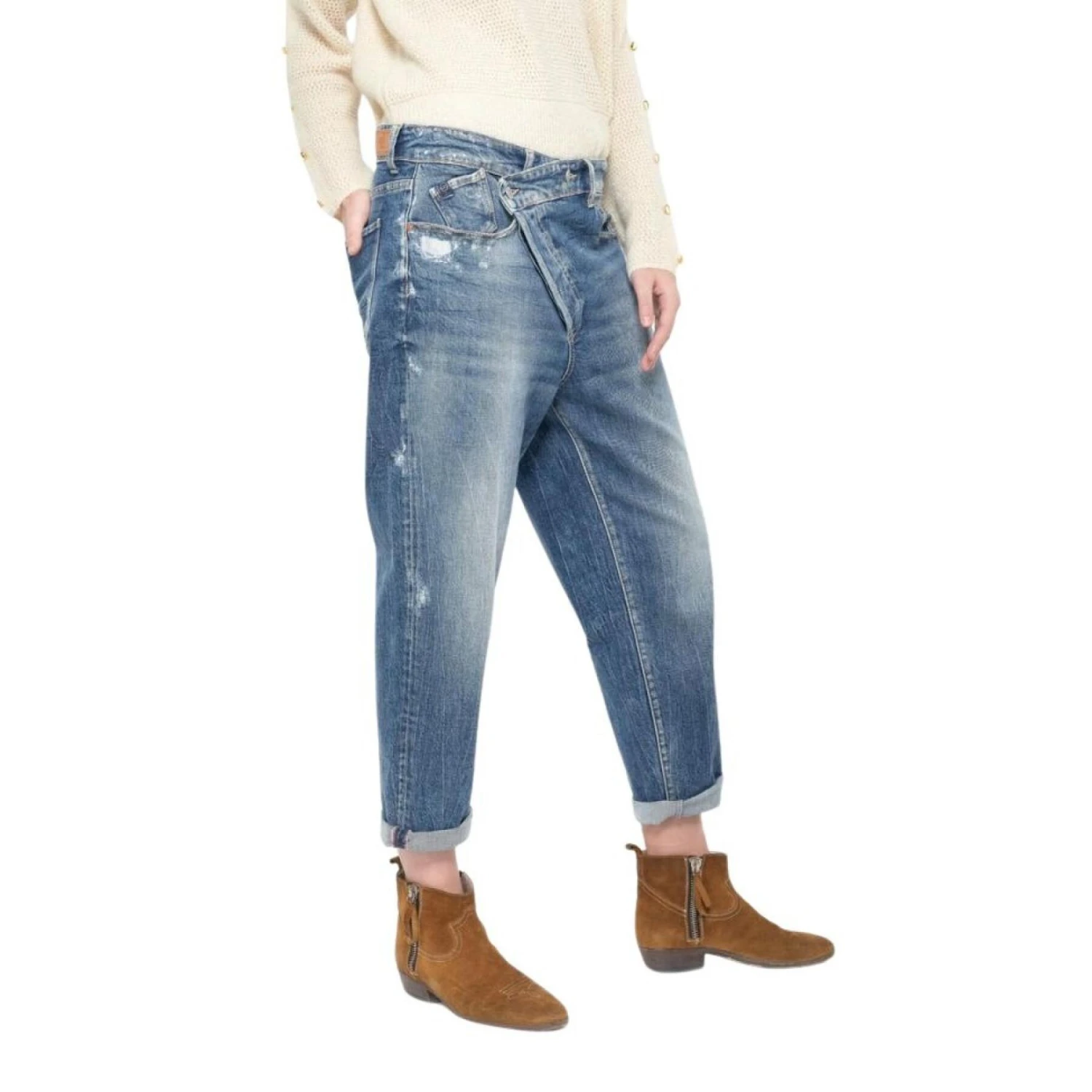 Deze losse jeans is trendy en origineel, met zijn asymmetrische knoopsluiting, schaafplekken en gerepareerde gaatjes voor nog meer stijl.