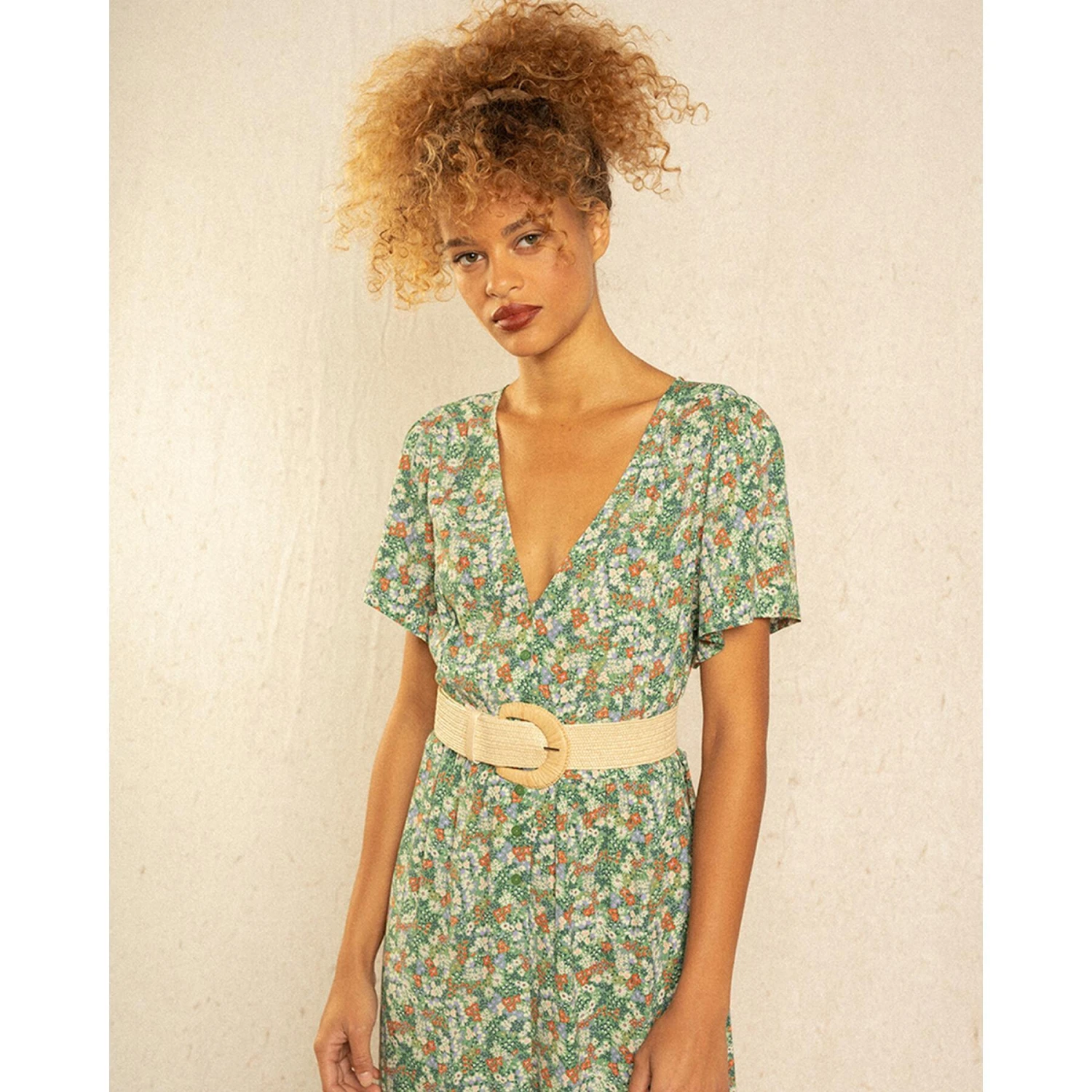 Hij heeft een knoopsluiting in de taille en maakt zijn look compleet met een bloemenprint die vrouwelijkheid en onschuld uitstraalt.