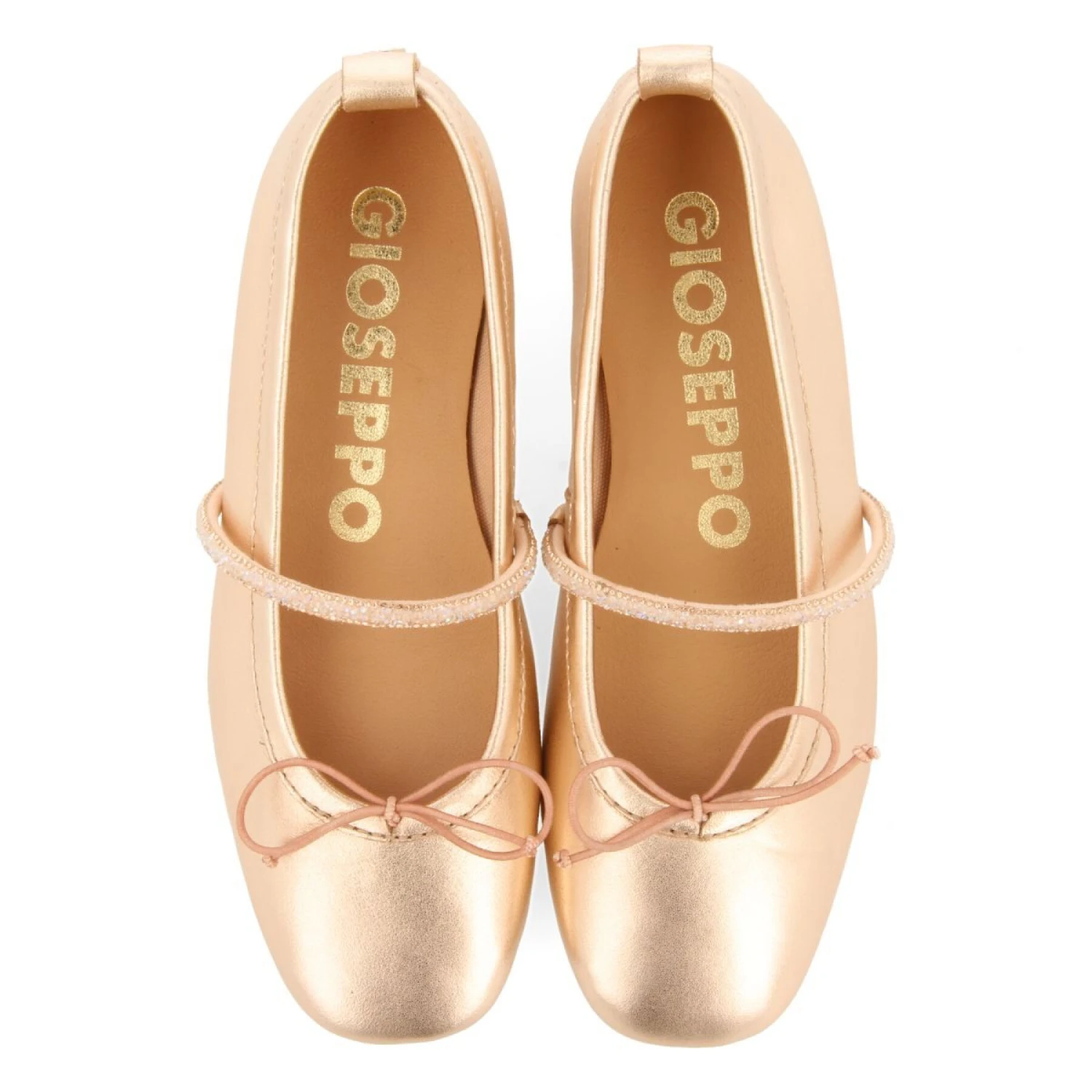 Ze zullen er dol op zijn! Goudkleurige leren ballerina’s rose. Ze hebben een buisvormige elastische band op de wreef, bedekt met juwelen. Ze hebben een flexibele zool en een gevoerde leren binnenzool, gelooid in leerlooierijen met een speciaal proces.