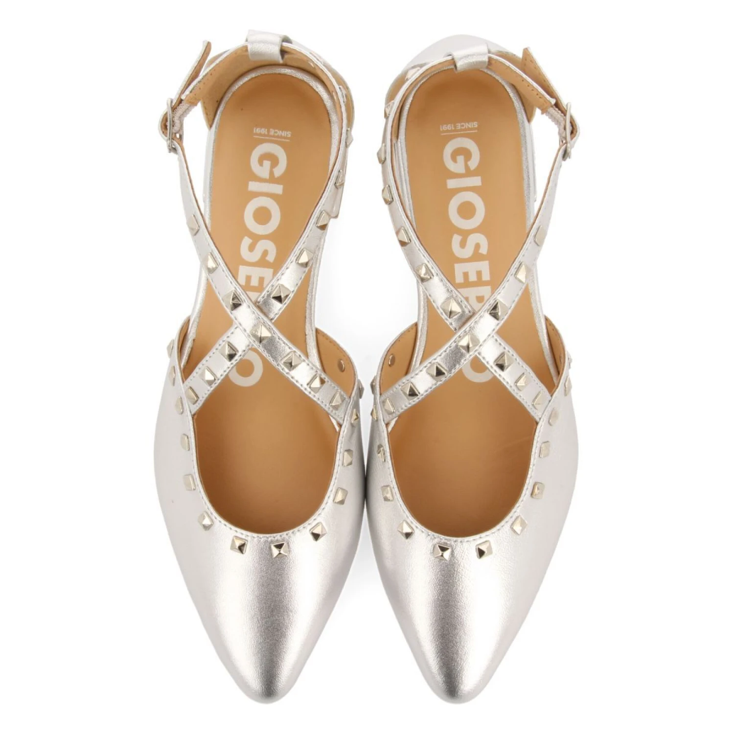 Een van de must-haves van dit seizoen! Zilveren leren ballerina’s met spitse neus, riempjes en studs. Verstelbaar enkelbandje voor een betere pasvorm. Leren voering. Zeer comfortabele dempende binnenzool van duurzaam gelooid leer volgens de normen van Leather Working Group. Flexibele zool. Ontdek de nieuwe SS24 ballerina collectie van Gioseppo Woman. Hakhoogte 1,5 cm.