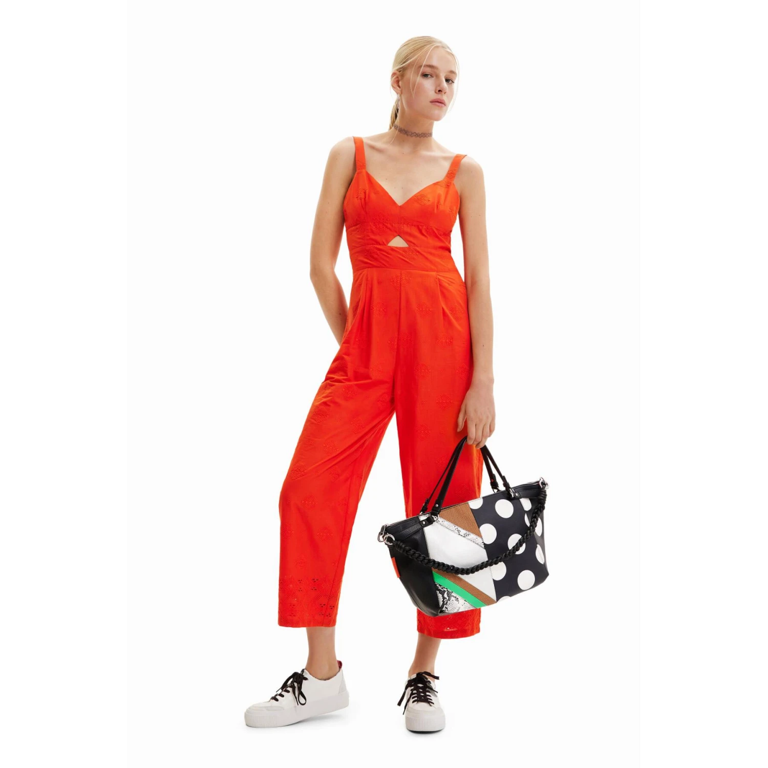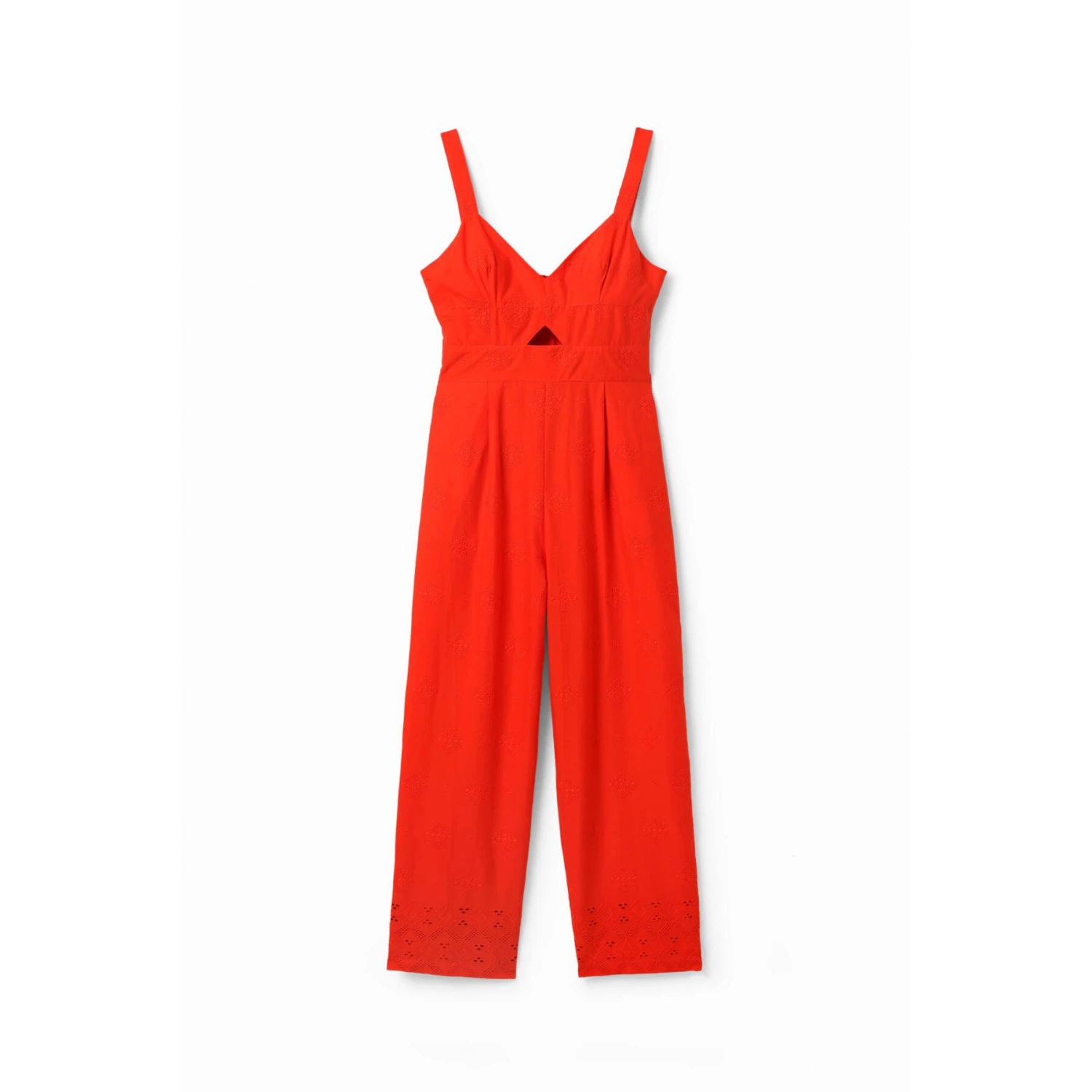 Deze lange jumpsuit is versierd met ton-sur-ton flocked borduurwerk, een overslaghals en grove bandjes. Combineer met de zomerse accessoires uit de collectie.