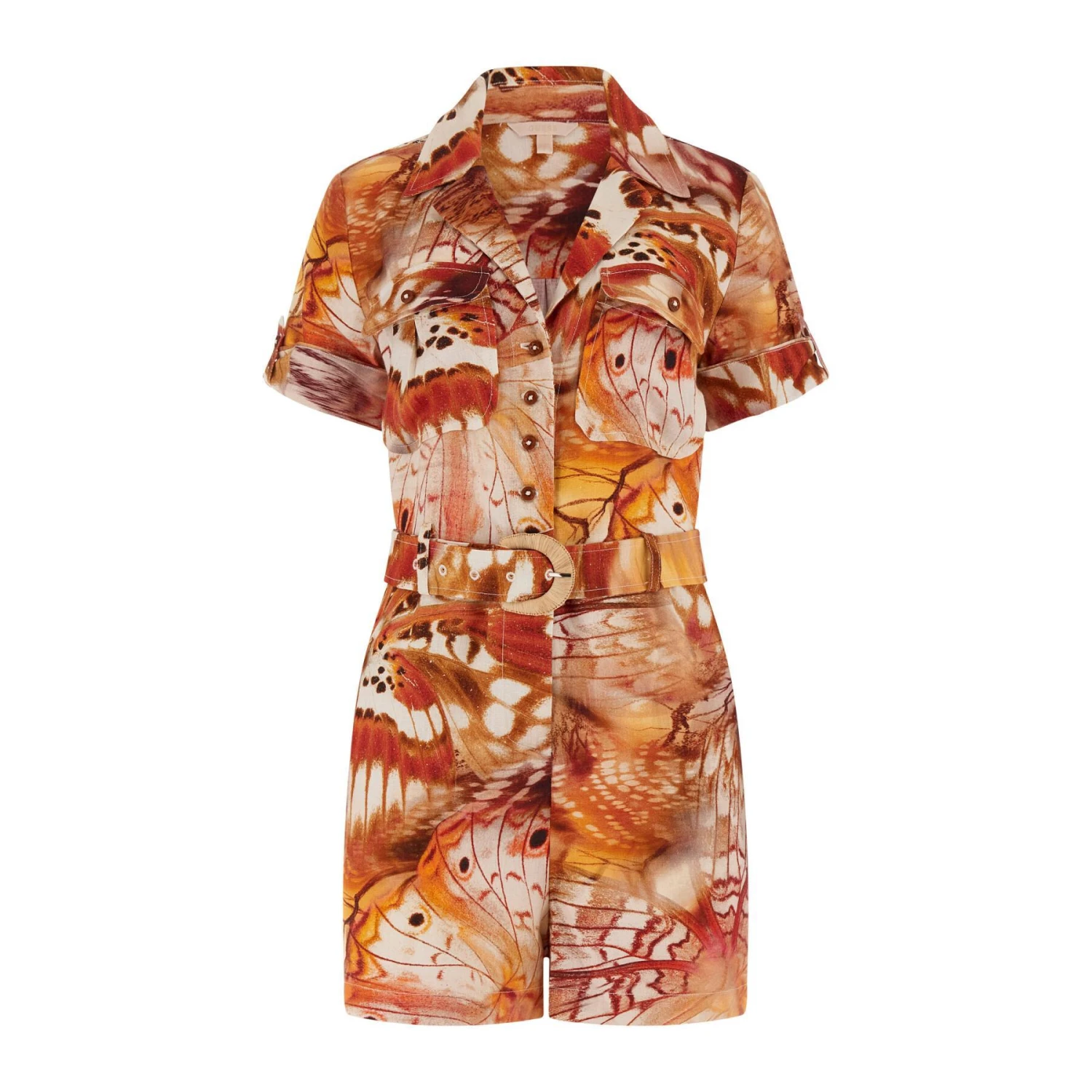 Verken een nieuwe plek in deze op de tropen geïnspireerde romper. Met een op de natuur geïnspireerde print, omgeslagen kraag, verstelbare riem met gesp en borstzakken met knopen. Bevat milieuvriendelijke houtvezel.