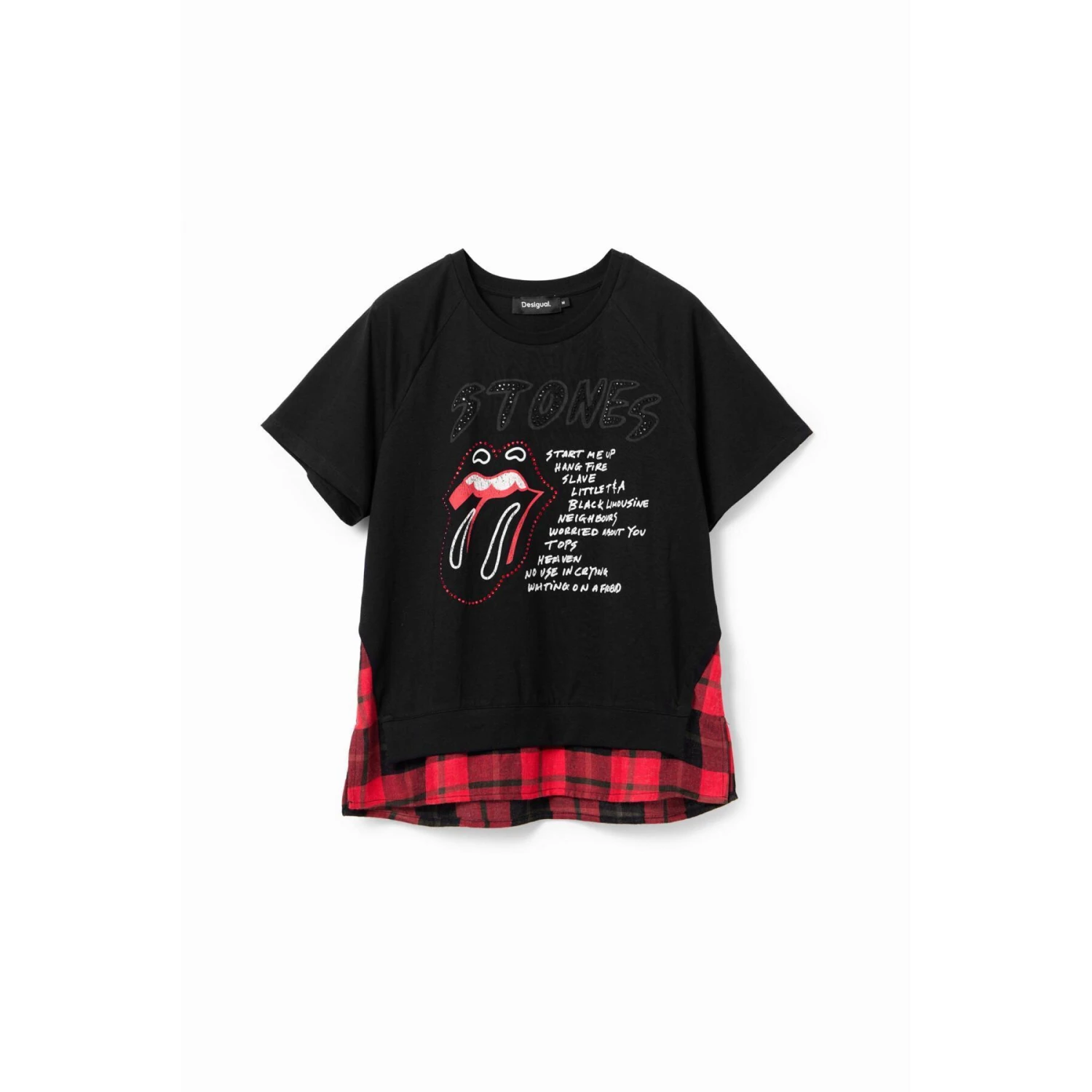 Een oversized T-shirt met korte mouwen, een The Rolling Stones-print op de voorkant en een geruite zoom.