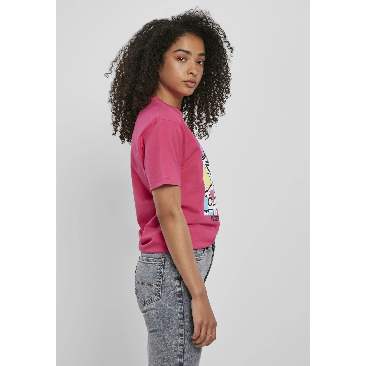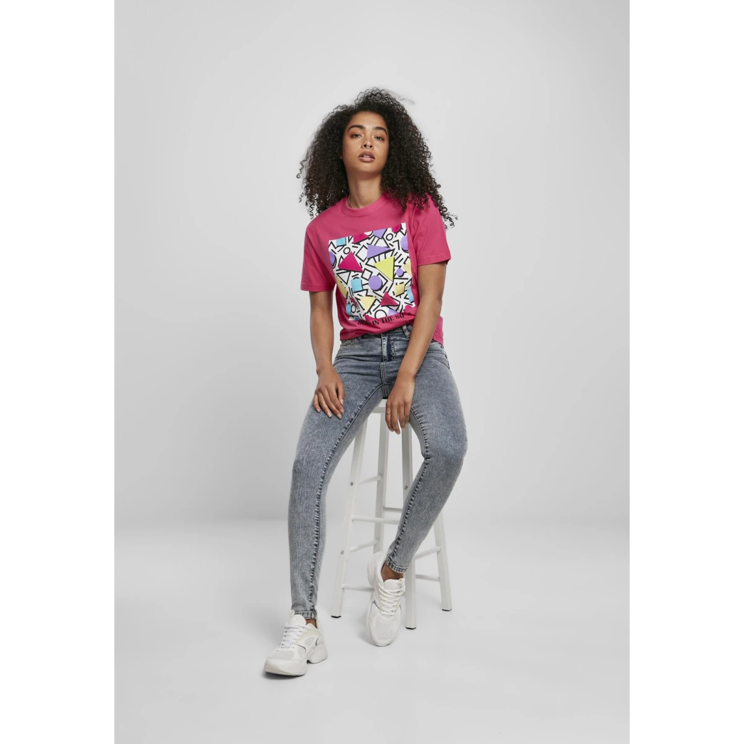 Een T-shirt dat precies zegt wat het zegt: Geboren in de jaren 80. Dat heeft dit T-shirt te danken aan zijn geometrische patroon met vierkante, driehoekige en ronde vormen en zijn kleur rose.