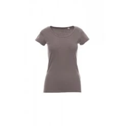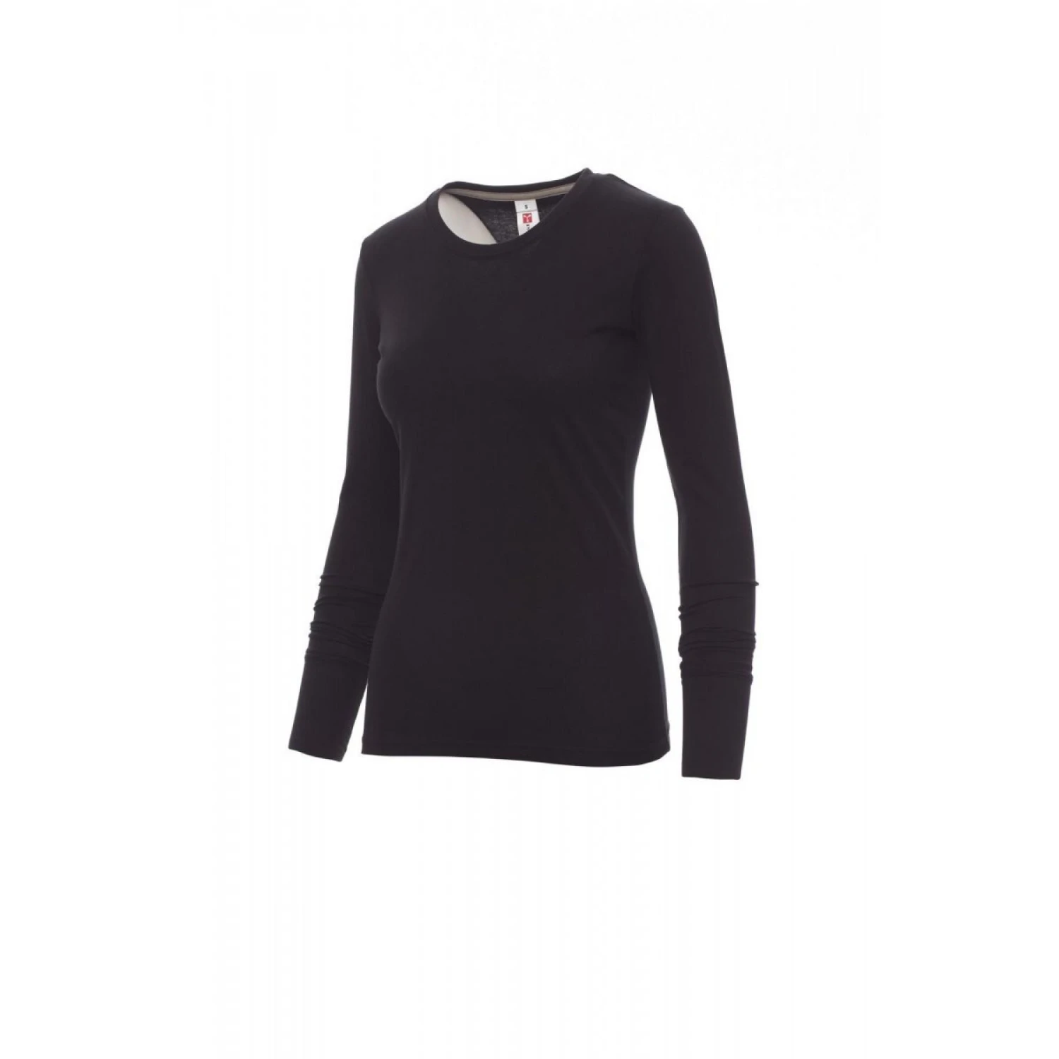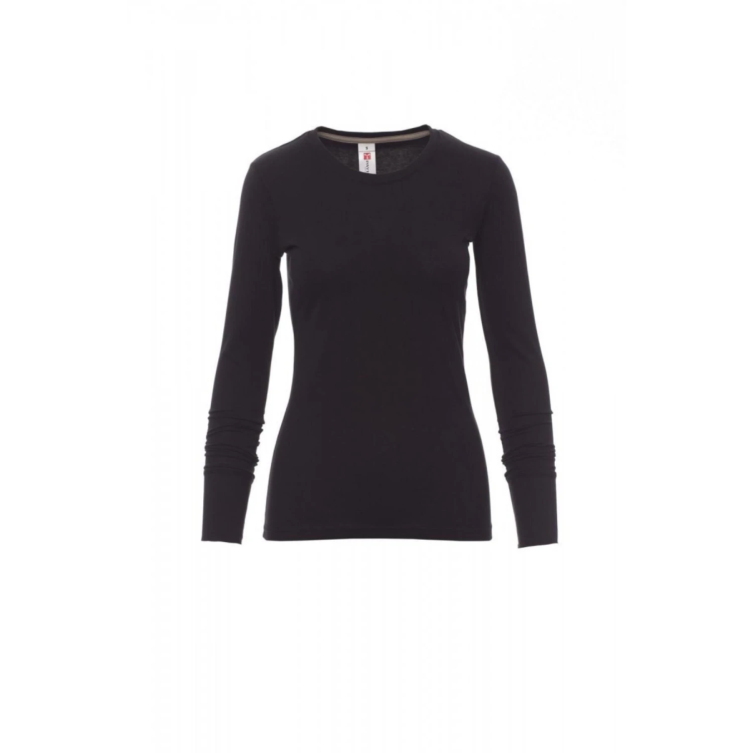 Slank gesneden dames-T-shirt, laag uitgesneden halslijn en lange mouwen, 1,5 cm geribbelde kraag in 1,5 cm gemengde spandex met gevouwen voornaad, lange manchet, schouder-aan-schouder verstevigingsband in contrasterende kleur op de kraag, elastische naden, zijnaad