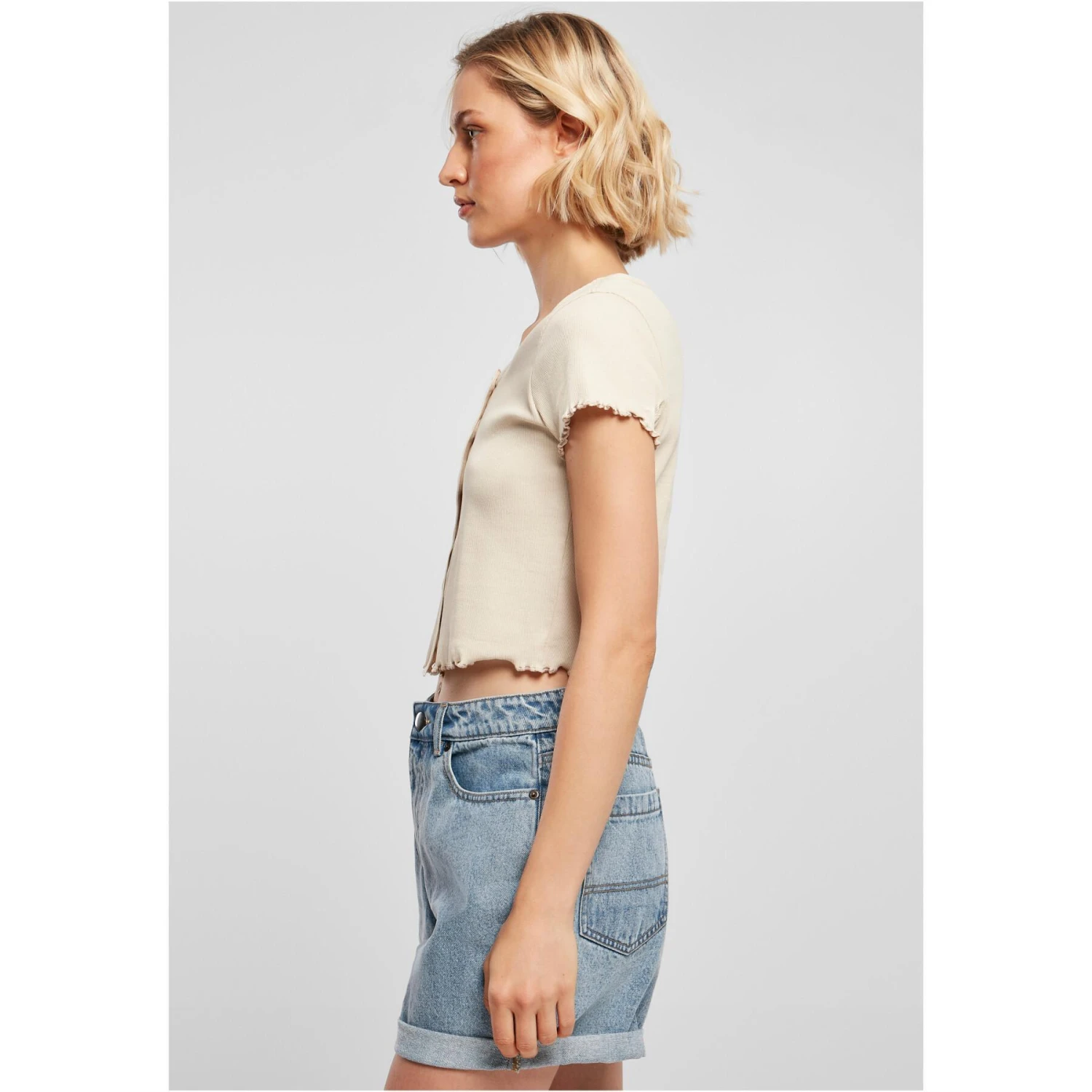 Een speels en vrouwelijk crop shirt met zorgvuldig geplaatste details. Vanaf de ronde halslijn, loopt een bijpassende button down. De zoom en de mouwen hebben golvende manchetten. Het geribde materiaal van katoen en elastaan zorgt voor een ideale pasvorm. Deze damestop heeft een normale pasvorm.Buitenstof 1: 97% katoen 3% elastaan, geribde jersey, 180 g/m