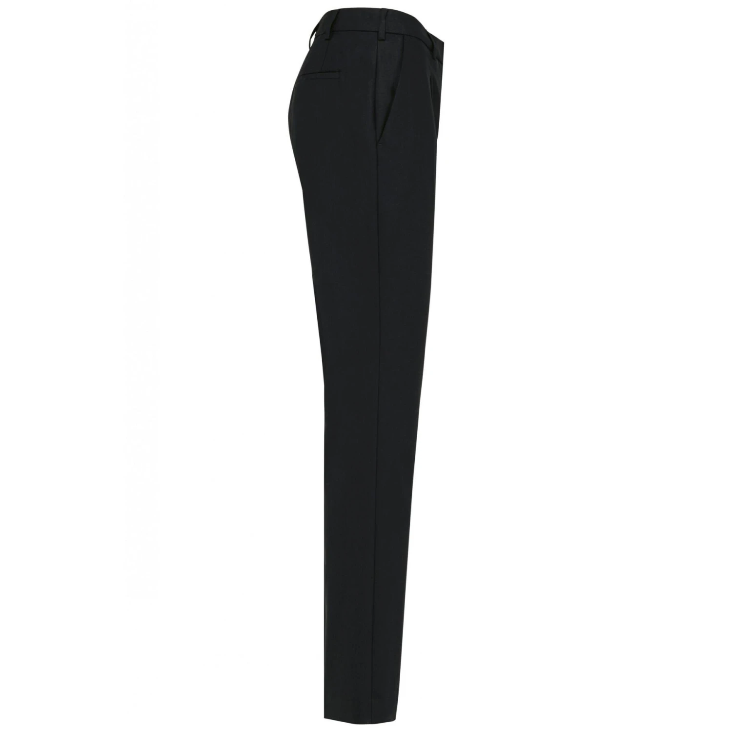 50% polyester / 23% viscose / 22% wol / 5% elastaan. Voering toon op toon 100% polyester. Slim fit broek. 2 zijzakken. 2 achter paspelzakken. Polyester keperstof zak. Ritssluiting met metalen clip en binnenin beschermd door een strook stof (onderdek) vastgehouden door een knoop voor meer comfort. Riemlussen in de taille. Binnenkant bias op de riem afwerking. Vouw aan de voorkant van het been. Geen merklabel, alleen een maatchip voor eenvoudige aanpassing.