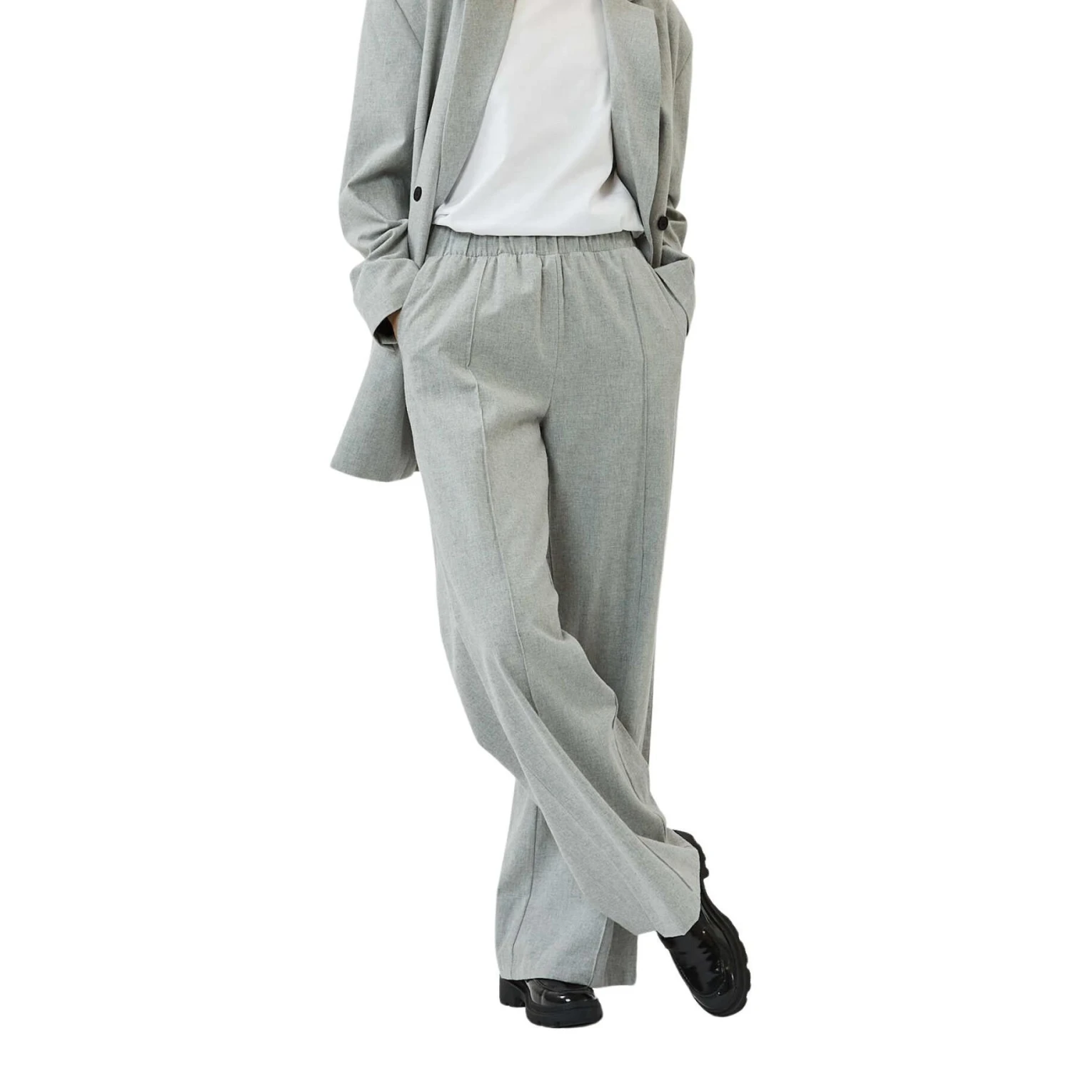 - De broek heeft een recht model met wijde pijpen en een middelhoge taille.
