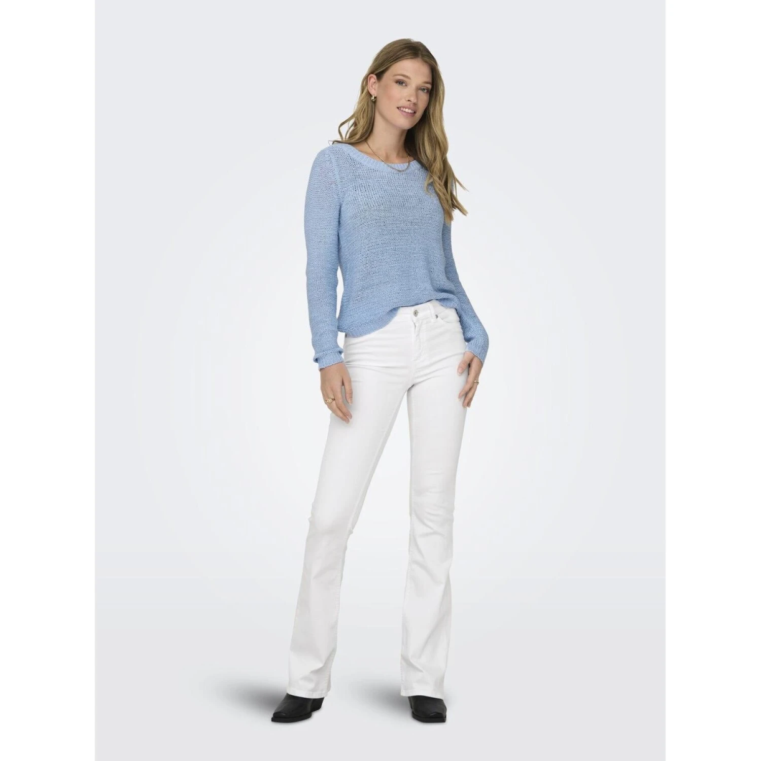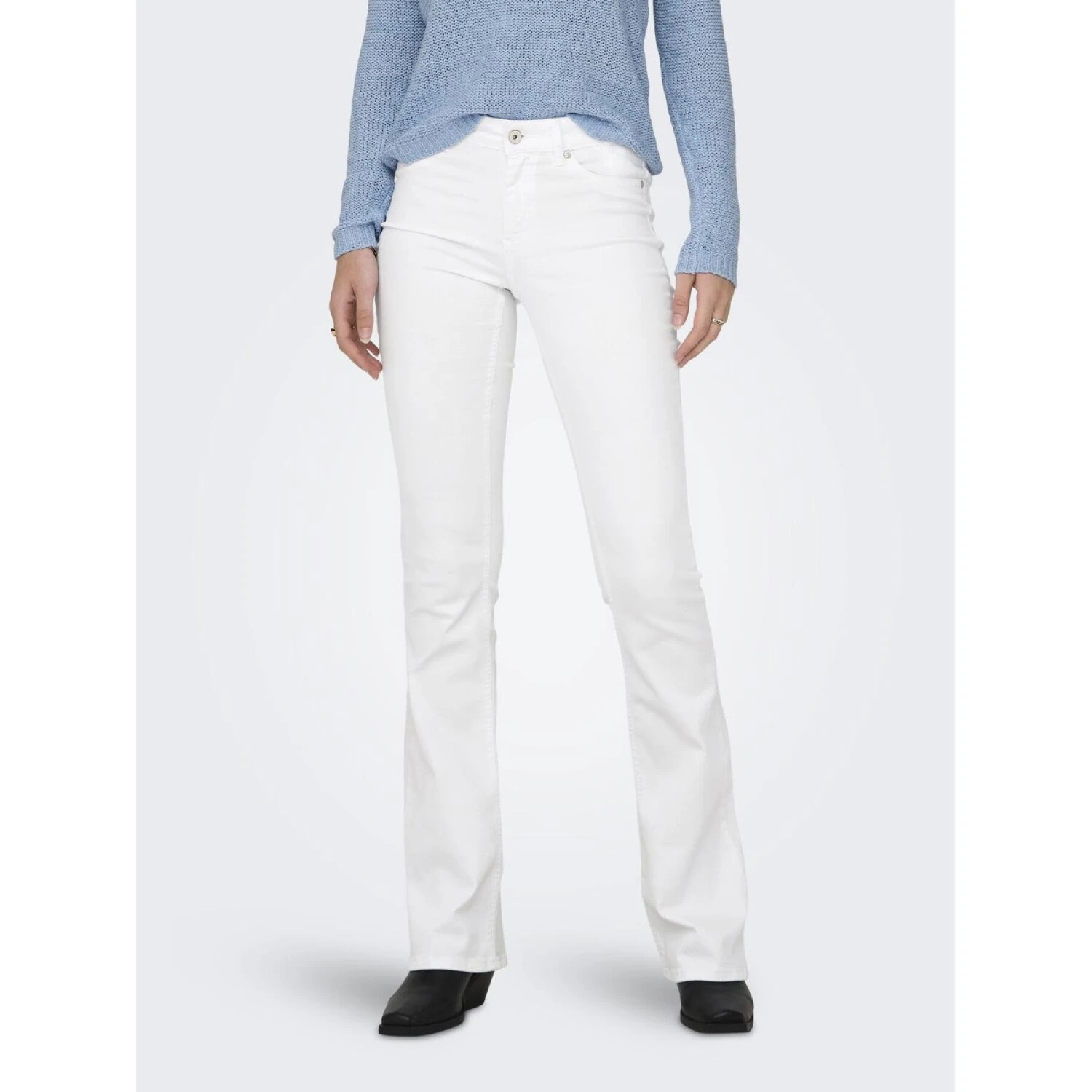 - Pasvorm: Deze flared jeans omhelst de heupen en dijen en loopt uit vanaf de knie.