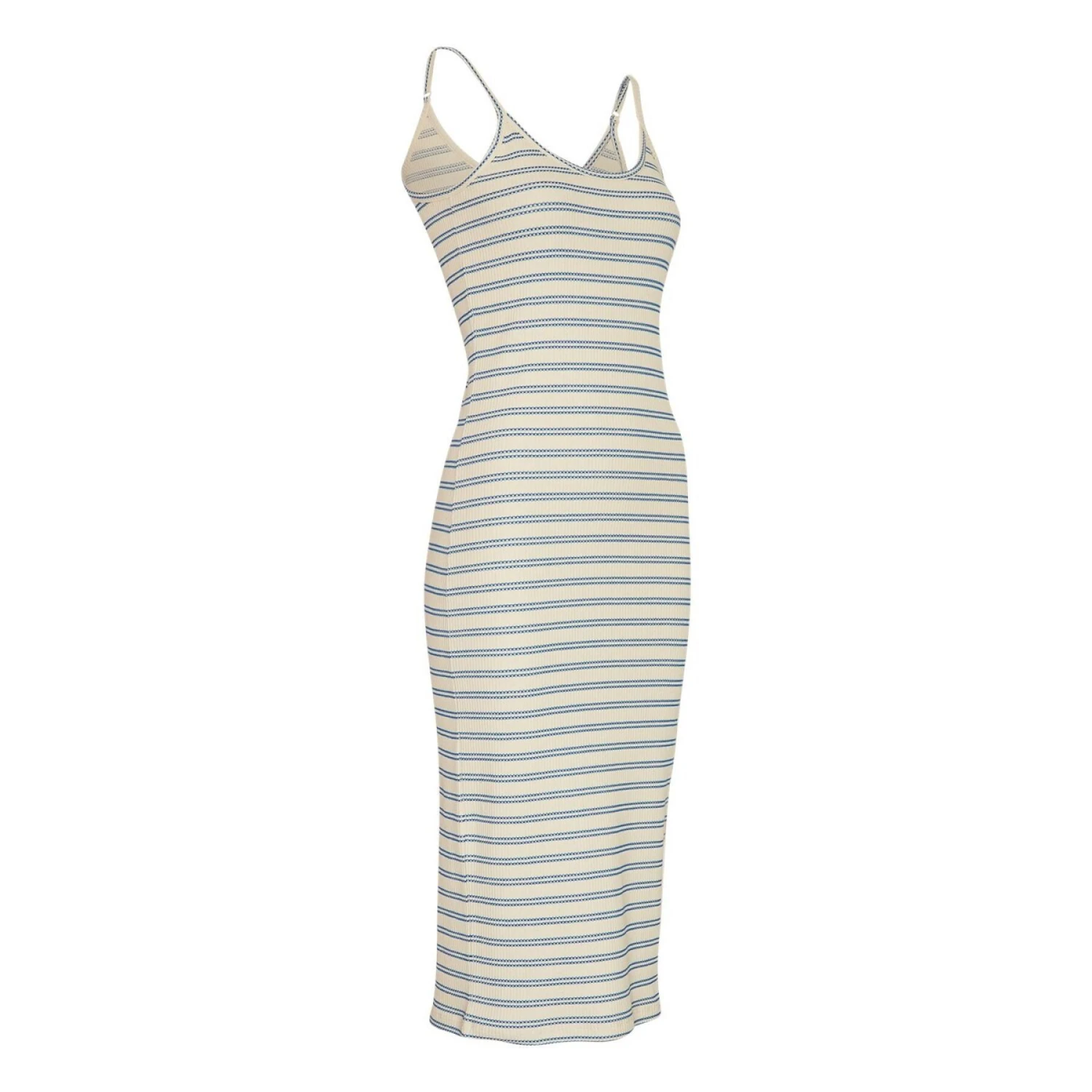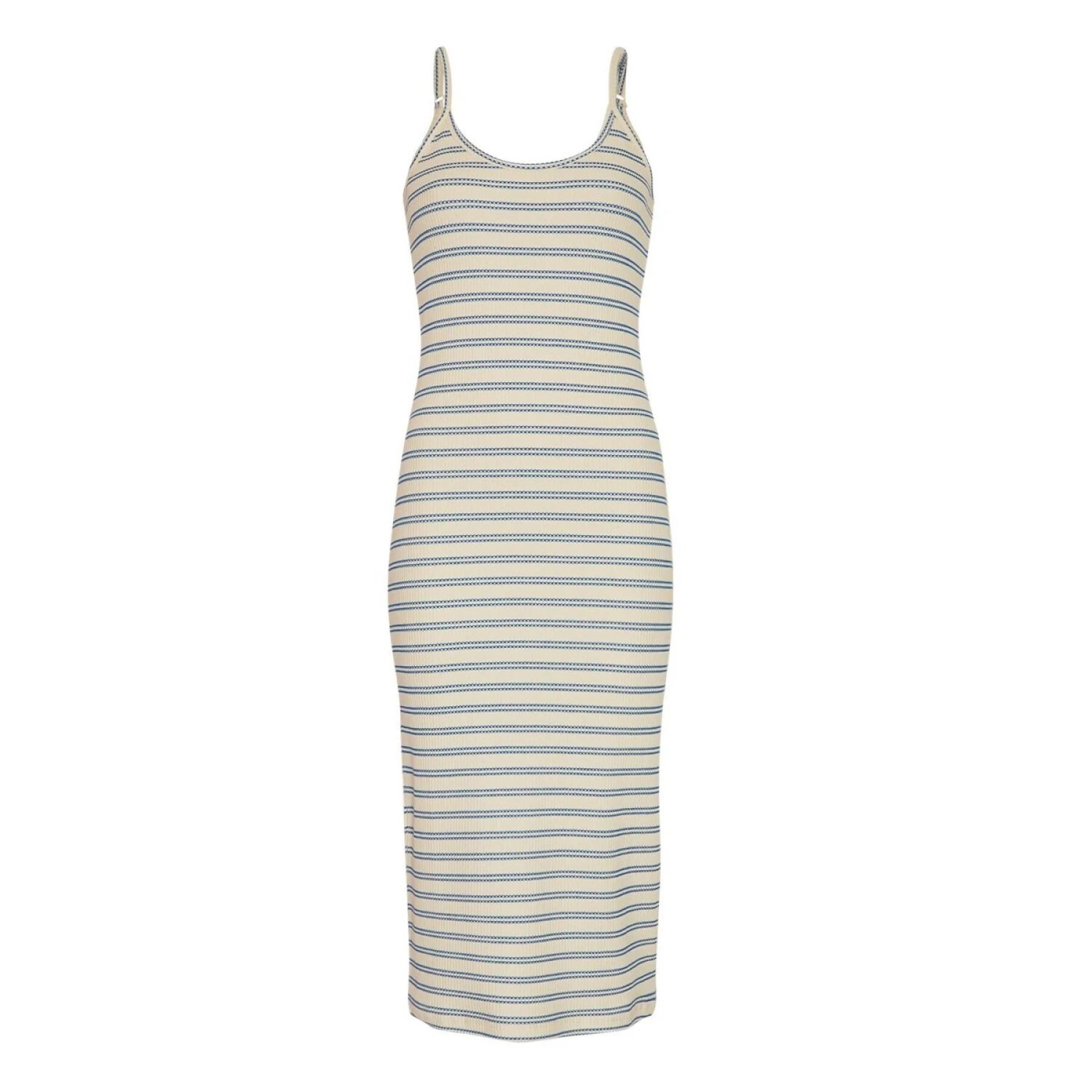 Deze onweerstaanbare jurk met twee rijen strepen accentueert uw taille en omhelst uw rondingen dankzij de verstelbare bandjes en de lengte onder de knie. Hij past zich aan elk lichaamstype aan en biedt een sensueel silhouet voor zonnige zomerdagen. Combineer hem met onze MSCH-hoed voor een wandeling door de stad of een oversized blazer voor een avondje uit.