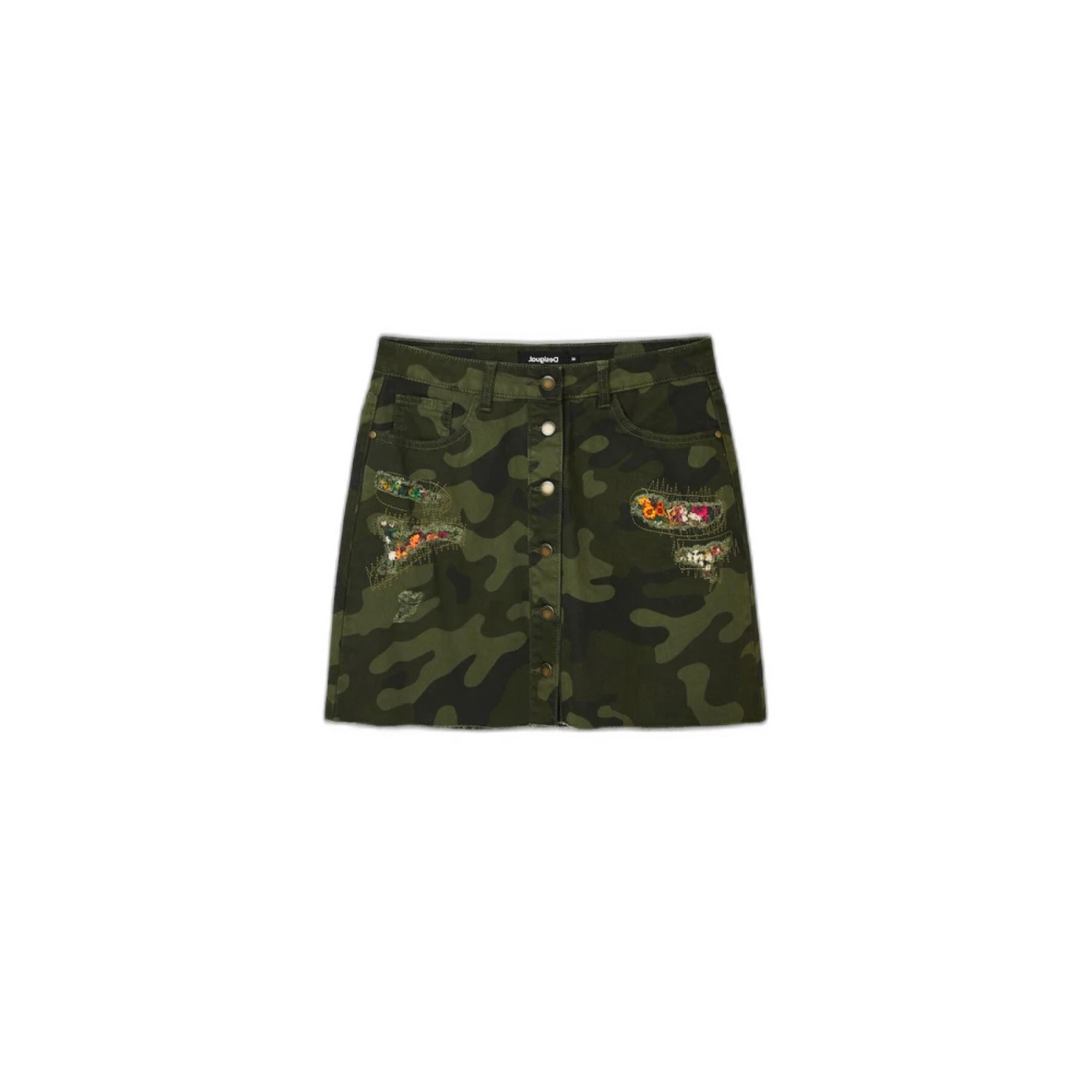 Deze minirok met camouflageprint heeft versleten details die een stof met bloemenprint onthullen. Het heeft een flatterend hooggesneden model met vijf zakken.