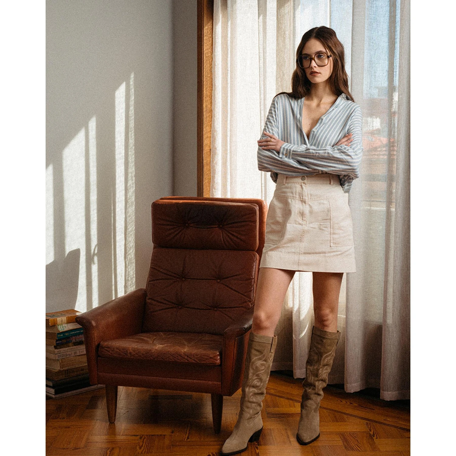 Het model Enisa is een korte denim rok met stikseldetails, een knoop- en ritssluiting en riemlussen in de taille.