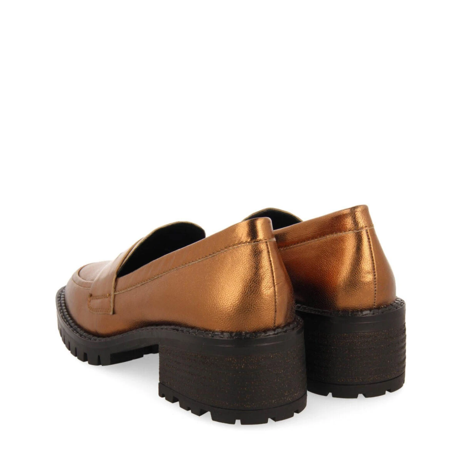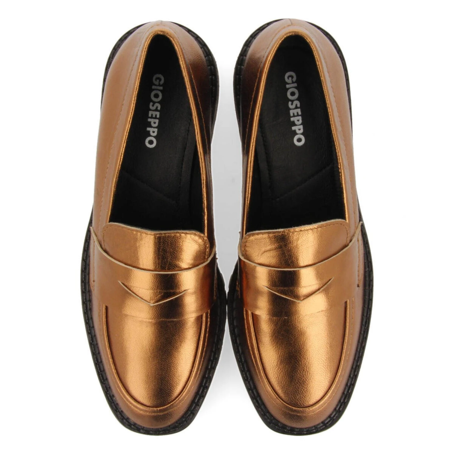 Een klassieker met een trendy twist. Bronskleurige leren loafers met spoorzool. Uitsparing, zool en voering van leer dat is gelooid met een duurzamer looiproces dat voldoet aan de normen van Leather Working Group. Zool zwaar opgevuld met latex voor meer comfort. Flexibele zool. Mis de nieuwe FW23 collectie mocassins van Gioseppo Woman niet.