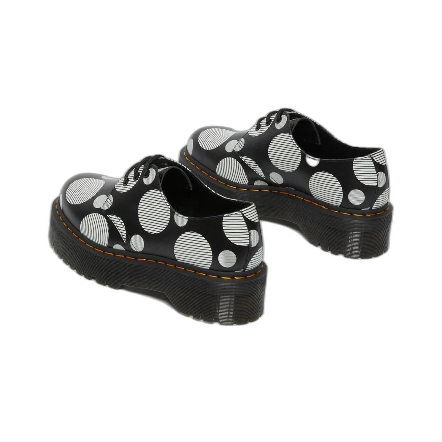 De nieuwe polka dot print van dit seizoen is een mix van stippen en strepen, een knipoog naar onze iconische gegroefde buitenzool. Deze plateauschoenen nemen een sterke indruk en zetten het volume nog wat hoger. Ze staan op onze Quad luchtkussentjes, zijn gemaakt van duurzaam glad leer en voorzien van gedipte veters. De schoenen zijn gemarkeerd met onze onmiskenbare gele biezen. De 1461, het tweede model in de DM-productielijn, is een schoen met drie ogen die bekend staat om zijn veelzijdigheid. Duurzaam en bekend om zijn stevigheid, kan ons gladde leer worden gepoetst tot een glans of geschuurd. De keuze is aan u. Schoonmaken met een vochtige doek en onderhouden met Dr. Martens schoenpoets.