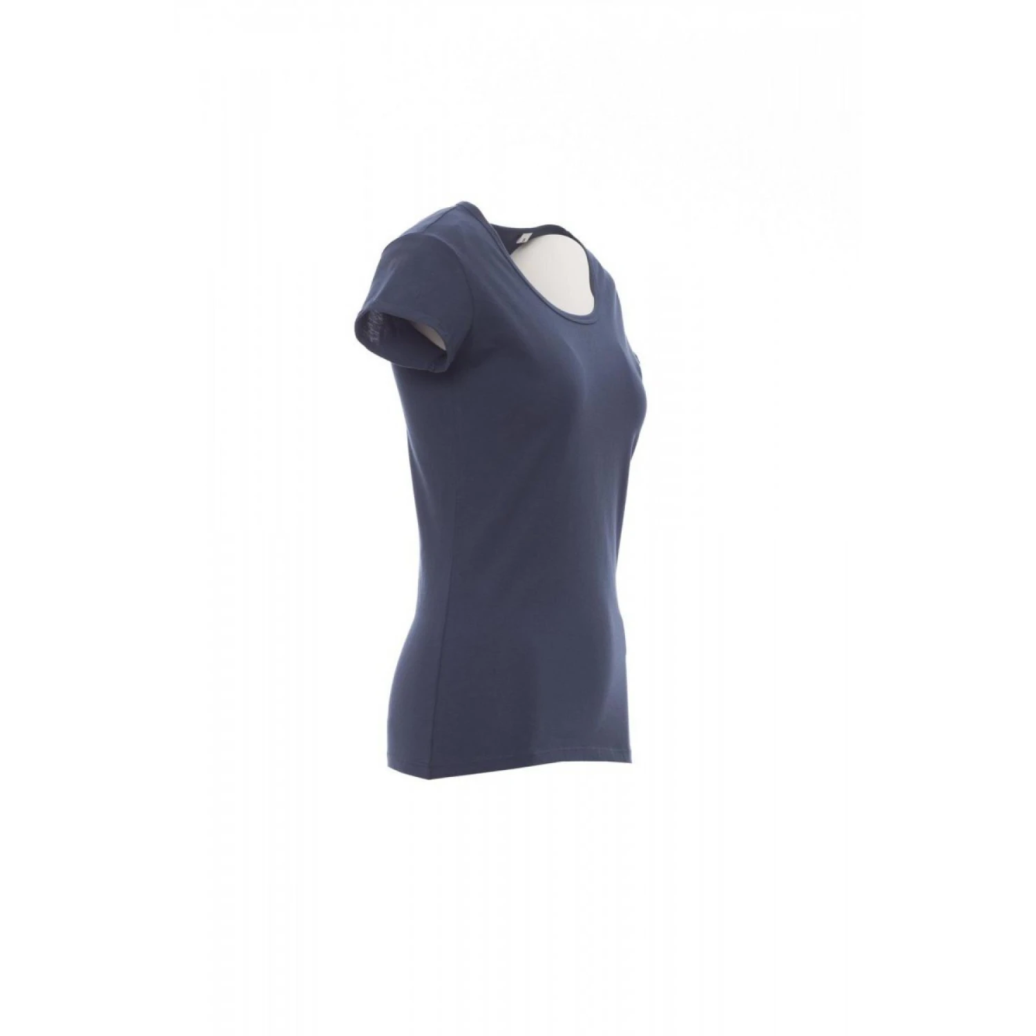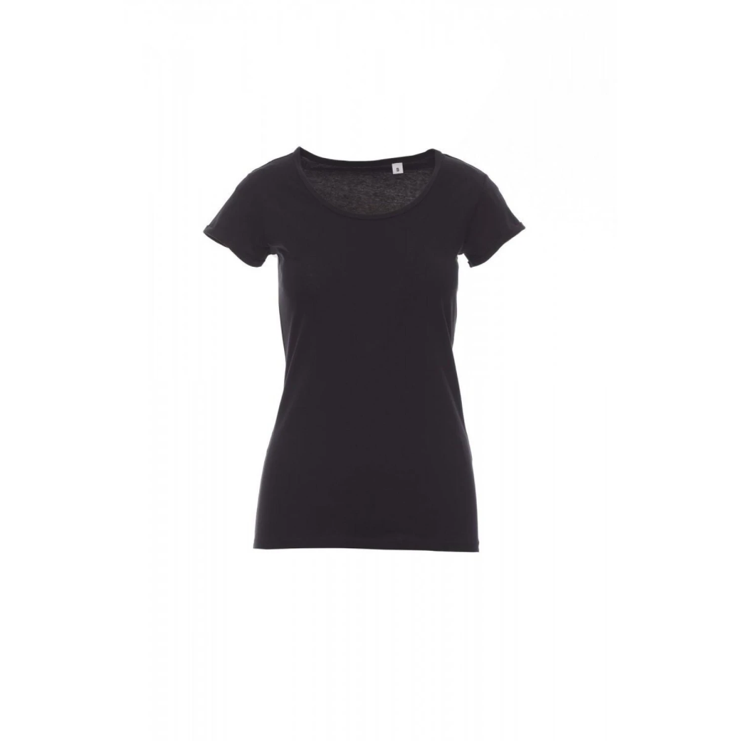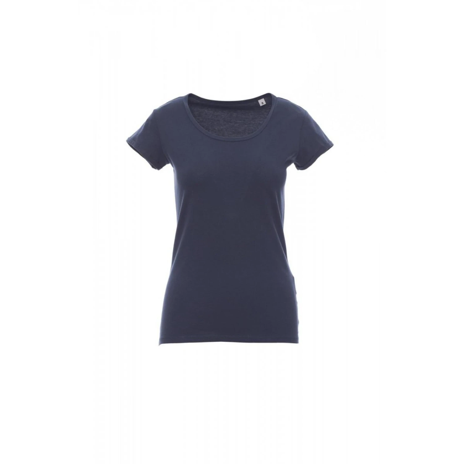 Slank gesneden dames-T-shirt met korte mouwen en een ietwat losse ronde hals, kraag met fijne rand, mouwafwerking met fijne revers met scherpe rand, zijdelingse naden