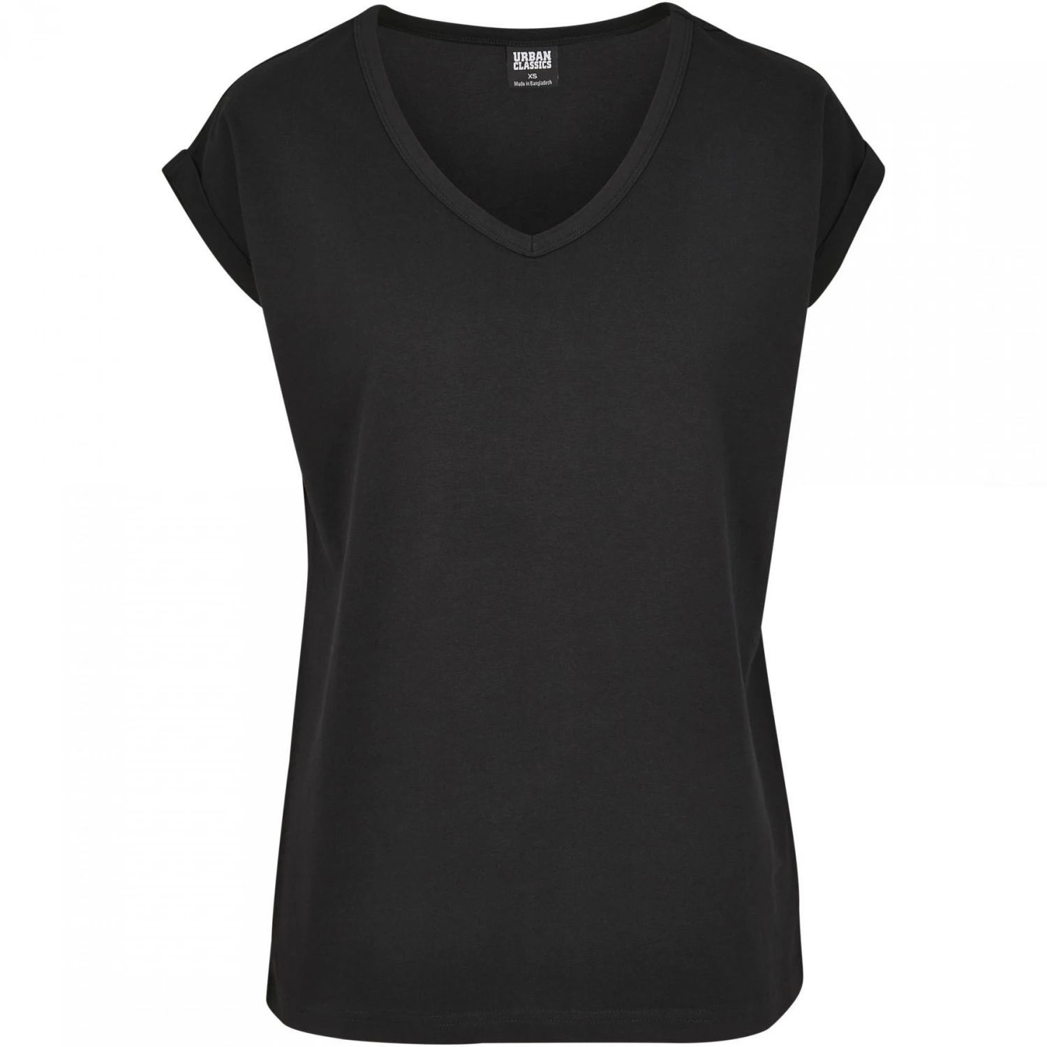 - Dit T-shirt heeft een diepe, afgeronde V-halslijn en schuine, omgeslagen mouwen.