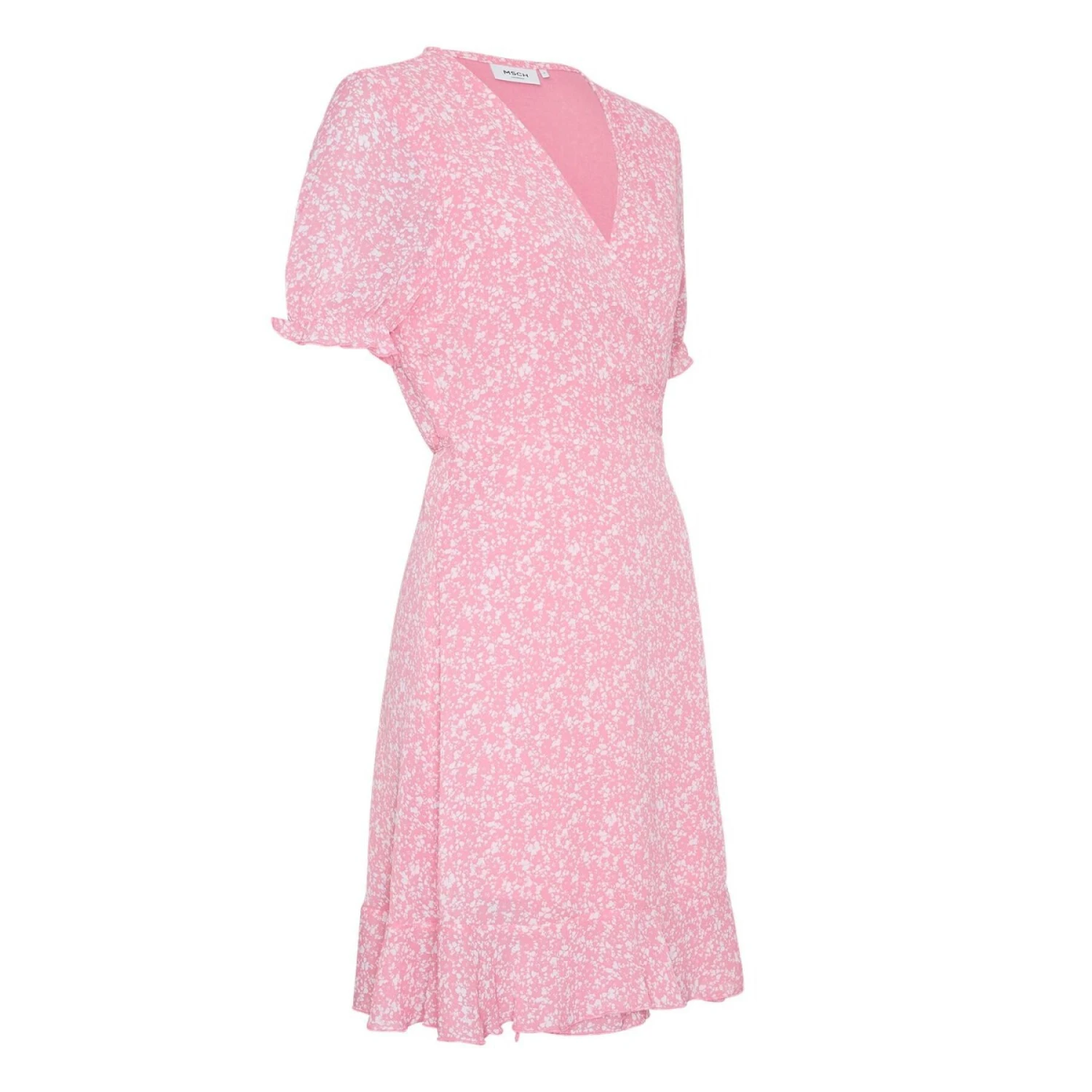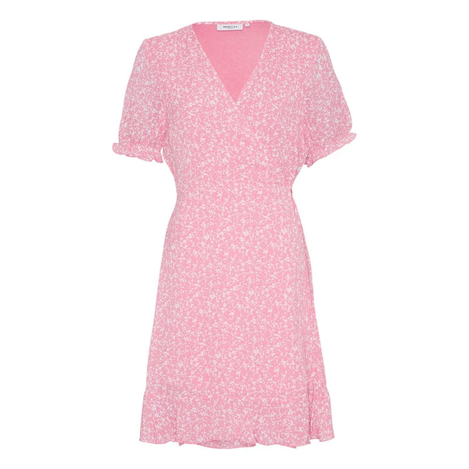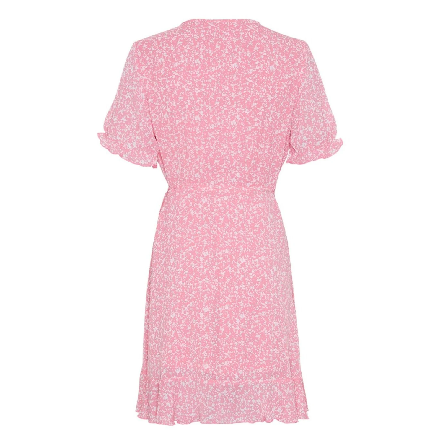 De perfecte wikkeljurk voor de zomer, met ruches en een V-hals in een mooie bloemenprint. Hij is ontworpen met een binnenlaag. De vloeiende stof met pronkt met de taille en komt tot net onder de knieën.